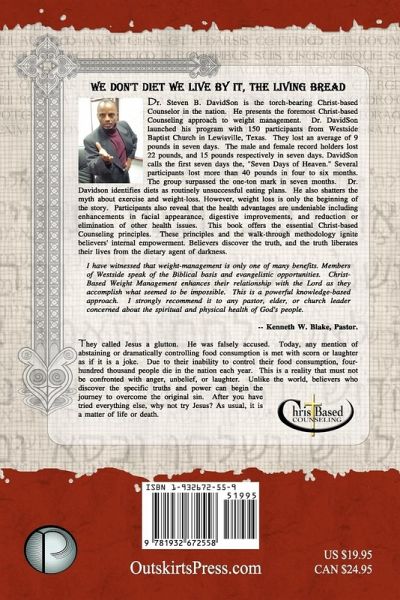 Dr. Steven B. DavidSon is the torch-bearing Christ-Based Counselor in the nation. He presents the foremost Christ-Based Counseling approach to weight management. Dr. DavidSon launched his program with 150 participants from Westside Baptist Church in Lewisville, Texas. They lost an average of 9 pounds in seven days. The male and female record holders lost 22 pounds, and 15 pounds respectively in seven days. DavidSon calls the first seven days the, "Seven Days of Heaven." Several participants lost more than 40 pounds in four to six months. The group surpassed the one-ton mark in seven months. Dr. Davidson identifies diets as routinely unsuccessful eating plans. He also shatters the myth about exercise and weight-loss. However, weight loss is only the beginning of the story. Participants also reveal that the health advantages are undeniable including enhancements in facial appearance, digestive improvements, and reduction or elimination of other health issues. This book offers the essential Christ-Based Counseling principles. These principles and the walk-through methodology ignite believers' internal empowerment. Believers discover the truth, and the truth liberates their lives from the dietary agents of darkness.