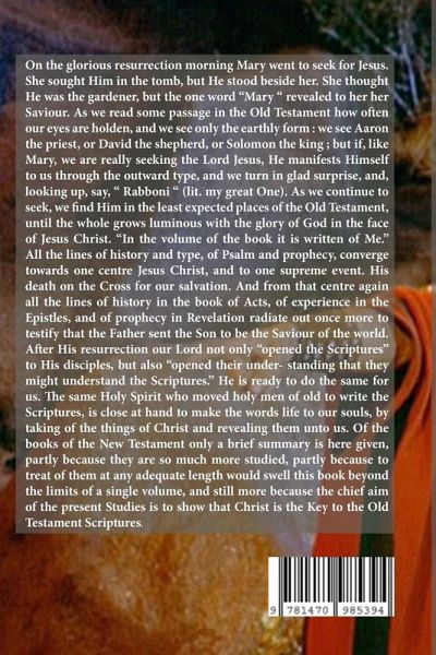 This book seeks to demonstrate that those references to Christ are found in all of the Sciptures. On the glorious resurrection morning Mary went to seek for Jesus. She sought Him in the tomb, but He stood beside her. She thought He was the gardener, but the one word "Mary " revealed to her her Saviour. As we read some passage in the Old Testament how often our eyes are holden, and we see only the earthly form : we see Aaron the priest, or David the shepherd, or Solomon the king ; but if, like Mary, we are really seeking the Lord Jesus, He manifests Himself to us through the outward type, and we turn in glad surprise, and, looking up, say, " Rabboni " (lit. my great One). As we continue to seek, we find Him in the least expected places of the Old Testament, until the whole grows luminous with the glory of God in the face of Jesus Christ. "In the volume of the book it is written of Me." All the lines of history and type, of Psalm and prophecy, converge towards one centre Jesus Christ, and to one supreme event. His death on the Cross for our salvation. And from that centre again all the lines of history in the book of Acts, of experience in the Epistles, and of prophecy in Revelation radiate out once more to testify that the Father sent the Son to be the Saviour of the world. After His resurrection our Lord not only "opened the Scriptures" to His disciples, but also "opened their under- standing that they might understand the Scriptures." He is ready to do the same for us. The same Holy Spirit who moved holy men of old to write the Scriptures, is close at hand to make the words life to our souls, by taking of the things of Christ and revealing them unto us. Of the books of the New Testament only a brief summary is here given, partly because they are so much more studied, partly because to treat of them at any adequate length would swell this book beyond the limits of a single volume, and still more because the chief aim of the present Studies is to show that Christ is the Key to the Old Testament Scriptures.