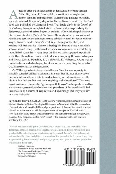 2009 Catholic Press Association Award Winner! A decade after the untimely death of renowned Scripture scholar Father Raymond E. Brown, SS, he continues to inspire and inform scholars and preachers, students and pastoral ministers, lay and ordained. It was only days after Father Brown's death that his final book was published by Liturgical Press. That book, Christ in the Gospels of the Ordinary Sundays, completed his six-volume series on preaching the Scriptures, a series that had begun in the mid-1970s with the publication of his popular An Adult Christ at Christmas. Those six volumes are collected here in one convenient commemorative edition to mark the tenth anniversary of Brown's death. Brown's work is left largely untouched, and readers will find that his wisdom is lasting. Yet Brown, being a scholar's scholar, would recognize the need for some enhancement in a work being republished some thirty years after the first volume appeared. Appropriately, then, this edition contains introductory essays by Brown's colleagues and friends John R. Donahue, SJ, and Ronald D. Witherup, SS, as well as useful indexes and a bibliography of resources for preaching the word of God in the context of the lectionary. As Witherup notes in his preface, Brown had the rare capacity to simplify complex biblical studies in a manner that did not 'dumb down ' the material but allowed it to be understood by a wide audience. . . . He did this in a fashion that was both inspiring and educational. That very broad audience --those who grew up with Brown, so to speak, as well as a whole new generation of readers and preachers of the word --will find this book to be a source of inspiration and knowledge that they will turn to again and again. Raymond E. Brown, S.S., (1928 -1998) was the Auburn Distinguished Professor of Biblical Studies at Union Theological Seminary in New York City. He was author of some forty books on the Bible and past president of three of the most important biblical societies in the world. By appointment of two popes (Paul VI in 1972, John Paul II in 1996) Brown was a member of the Roman Pontifical Biblical Commission. Time magazine called him probably the premier Catholic Scripture scholar of the U.S.