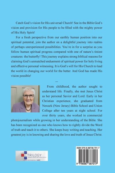 Catch God's vision for His universal Church! See in the Bible God's vision and provision for His people to be filled with the mighty power of His Holy Spirit! For a fresh perspective from our earthly human position into our spiritual potential, join the author on a delightful journey into realms of perhaps unexperienced possibilities. You're in for a surprise as you follow human spiritual progress compared with one of nature's tiniest creatures: the butterfly! This journey explains strong biblical reasons for claiming God's unmatched enduement of spiritual power for holy living and effective personal witnessing. It is God's will for His Church to lead the world in changing our world for the better. And God has made His vision possible!