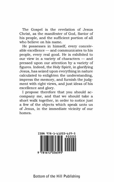 The Gospel is the revelation of Jesus Christ, as the manifester of God, Savior of his people, and the sufficient portion of all who believe on his name. He possesses in himself, every conceivable excellence - and communicates to his people, every real good. He is exhibited to our view in a variety of characters - and pressed upon our attention by a variety of figures. Indeed, the Holy Spirit, in glorifying Jesus, has seized upon everything in nature calculated to enlighten the understanding, impress the memory, and furnish the judgment with right views, and just ideas of his excellence and glory. I propose therefore that you should accompany me, and that we should take a short walk together, in order to notice just a few of the objects which speak unto us of Jesus, in the immediate vicinity of our homes.