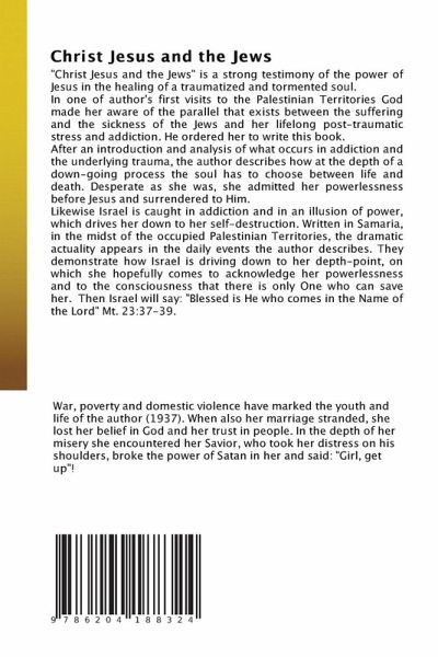 "Christ Jesus and the Jews" is a strong testimony of the power of Jesus in the healing of a traumatized and tormented soul.In one of author's first visits to the Palestinian Territories God made her aware of the parallel that exists between the suffering and the sickness of the Jews and her lifelong post-traumatic stress and addiction. He ordered her to write this book.After an introduction and analysis of what occurs in addiction and the underlying trauma, the author describes how at the depth of a down-going process the soul has to choose between life and death. Desperate as she was, she admitted her powerlessness before Jesus and surrendered to Him.Likewise Israel is caught in addiction and in an illusion of power, which drives her down to her self-destruction. Written in Samaria, in the midst of the occupied Palestinian Territories, the dramatic actuality appears in the daily events the author describes. They demonstrate how Israel is driving down to her depth-point, on whichshe hopefully comes to acknowledge her powerlessness and to the consciousness that there is only One who can save her. Then Israel will say: "Blessed is He who comes in the Name of the Lord" Mt. 23:37-39.