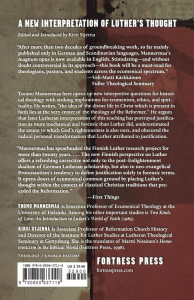 Mannermaa's revisionist work on justification in Luther's theology--a notable contribution from one of the most influential Finnish scholars of Luther studies-- is now available in English. His book opens up new interpretive questions for historical theology with striking implications for ecumenism, ethics, and spirituality. He writes, "the idea of the divine life in Christ which is present in faith lies at the very center of the theology of the Reformer." He argues that later Lutheran interpretation of this teaching has portrayed justification as more mechanical and forensic than Luther did, underestimated the extent to which God's righteousness is also ours, and obscured the radical personal transformation that Luther attributed to justification.