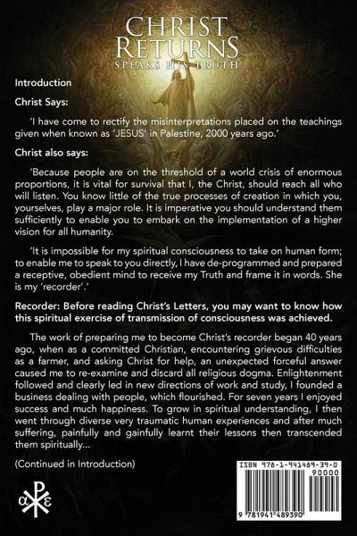 Kindle / eReader Versions available at ChristReturns.org THESE LETTERS are a MASTER'S COURSE. Expanded Edition Includes: Letter 1. Christ speaks of his reasons for returning to dictate these Letters. Says that mankind brings their own woes upon them through their thoughts and actions. Explains why his true mission on earth was not recorded properly. Says there is no such thing as ‘sin against God’; neither is our true Source of Being understood. Describes his six weeks in the desert and what really took place – what he learnt and how the knowledge changed him from rebel to Master and Healer. Letter 2. Continues the story of his life on earth, his return to his mother in Nazareth and reception! His first public healing and the tremendous response. Choosing disciples. His true teachings. Letter 3. Continues life incidents, teachings, his awareness that his time on earth was to be cut short by crucifixion. The things he did to arouse the anger of the Jewish Religious Leaders. What really took place and was said at the ‘Last supper’, the disciples’ attitudes, and the truth concerning his ‘ascension’. Letter 4. Christ gathers up the threads of his teachings in Palestine and says that he and Muhammad, Buddha and all other Masters have continued to develop spiritually until they have all ascended into CHRIST CONSCIOUSNESS. Christ speaks of the truth of the sexual relationship, saying that the attitude between men and women will eventually change. Spiritual progress will take place and children with new spiritual potential will be born. Letter 5 & 6. Christ begins to explain the true processes of creation. He touches on what science and religious doctrines have believed, rejects them and defines the TRUTH of BEING. He touches on the truth regarding the human ego, – the means of earthly individuality and therefore necessary, but also the source of all suffering. Letter 7. Christ describes the truth concerning the sexual act – what really takes place spiritually and physically. How children are born on different levels of consciousness. He explains men and women’s place in the world order. Letter 8. Christ explains the reality of men and women, how to live within the LAWS of EXISTENCE and come into a state of harmonious blessed state of being in which all things are abundantly provided, health is restored, and joy becomes a natural state of mind. Every individual can reach this interior state of blessedness, and peace will then become the norm. Letter 9. Christ ties up loose ends of his other Letters and tells people plainly how to overcome the ego, gain true self-esteem and experience the joy of perfect inner peace. He touches on racism and a personal message of encouragement and love to all who are drawn to his Letters. 16 Articles Christ Returns 2007 Message Christ Returns 2014 Message Study Resources