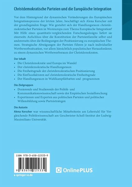 Vor dem Hintergrund der dynamischen Veränderungen des Europäischen Integrationsprozess der letzten Jahre, beschäftigt sich Alena Kerscher mit der grundlegenden Frage: Wie gestaltet sich der Handlungsraum christdemokratischer Parteien in Westeuropa zum Thema Europäische Integration? Mit Hilfe eines quantitativ-vergleichenden Forschungsdesigns liefert sie einerseits Aufschluss über die Konstitution der Parteienfamilie selbst und andererseits über die Bedingungen der Positionierung zu europäischen Themen. Strategische Abwägungen der Parteien führen je nach individueller Wettbewerbssituation, vor allem hinsichtlich populistischer Herausforderer, zu einem dynamischen Wettbewerbsraum der Christdemokraten.