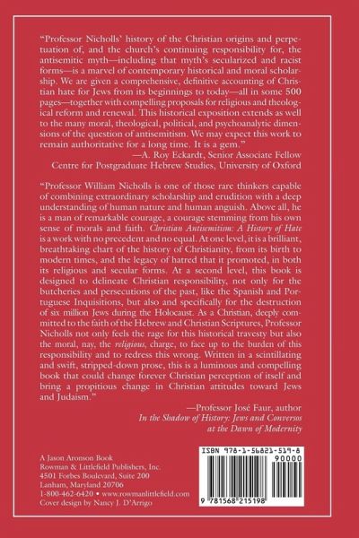 In Christian Antisemitism: A History of Hate, Professor William Nicholls, a former minister in the Anglican Church and the founder of the Department of Religious Studies at the University of British Columbia, presents his stunning research, stating that Christian teaching is primarily responsible for antisemitism. As Nicholls states, these conclusions "can now be fully justified by the most up-to-date scholarship, Christian as well as Jewish." Nicholls writes, "Many Jewish writers have said, quite simply, that the Nazis chose the Jews as the target of their hate because two thousand years of Christian teaching had accustomed the world to do so. Few Christian historians and theologians have been sufficiently open to the painful truth to accept this explanation without considerable qualification. Nevertheless, it is correct." Christian Antisemitism traces, over two millennia, the growing domination of Western culture by the Christian "myth" (as Nicholls calls it) about the Jews, and shows how it still exerts a major influence even on the secularized "post-Christian world." Nicholls shows, through scrupulous research and documentation, that the myth of the Jews as Christ-killers has powered anti-Judaism and antisemitism throughout the centuries. Nicholls clearly illustrates that this myth is present in the New Testament and that "it has not yet died under the impact of modern critical history." Also included in this remarkable volume is Nicholls' research regarding the Jewishness of Jesus. He writes, "Historical scholarship now permits us to affirm with confidence that Jesus of Nazareth was a faithful and observant Jew who lived by the Torah and taught nothing against his own people and their faith...the Romans, not the Jews, were the Christ-killers." In Part I, "Before the Myth," Nicholls explores the life of Jesus and his teachings as found in the New Testament. Was Jesus the founder of Christianity? Did he offer teachings against his people? Did he believe himself?