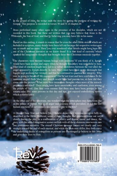 "Christian Bible Drama Series, Christmas Edition" presents two engaging musicals that capture the essence of the Christmas story. It is a literary masterpiece that deserves the highest praise. Both musicals share the same core message and the central figure of Jesus, yet they unfold through different plots, offering fresh and creative perspectives on the timeless tale. Leslie's work is both accessible and deeply meaningful, making it a wonderful addition to any Christmas celebration, whether for personal enjoyment or church performances. Despite differing in plot, both pieces converge on the same central message: the birth and significance of Jesus Christ. Leslie masterfully balances creativity and theological depth, ensuring that each musical resonates with both its narrative innovation and its faithfulness to the Biblical account. The first musical offers a traditional take on the Christmas story, filled with familiar characters and scenes that evoke the warmth and wonder of the Nativity. Through thoughtful dialogue and stirring musical numbers, Leslie captures the profound simplicity of Christ's birth, emphasizing themes of hope, love, and divine intervention. The traditional elements are presented with a fresh vibrancy that engages both new audiences and those well-versed in the Christmas narrative. The second musical diverges in its plot, presenting the Christmas story through a contemporary lens or an alternative setting. This approach not only showcases Leslie's creative prowess but also serves to highlight the timeless and universal relevance of the Christmas message. By placing familiar events in new contexts, he invites the audience to see the story from different angles, deepening their understanding and appreciation of its core message. "Christian Bible Drama Series, Christmas Edition" is an exceptional literary work that beautifully reimagines the timeless tale of the Christmas narrative. Pastor Leslie's revised edition takes readers on a captivating journey, exploring the untold emotions, conflicts, and intricate details surrounding the birth of Jesus. Through a masterful blend of poetry, drama, music, and dance, the author breathes new life into familiar characters and events, leaving readers spellbound. What sets this book apart is its ability to evoke a deep sense of empathy and connection with the characters. Pastor Leslie artfully delves into the inner thoughts and struggles of figures like Joseph and Mary, inviting readers to experience their doubts, fears, and unwavering faith. By peeling back the layers of these characters' humanity, the author unveils a profound and relatable narrative that resonates with readers on a personal level. Whether for a live audience or as a cinematic production, both musicals have the potential to mesmerize audiences and bring the profound message of the Christmas narrative to a wider audience. Pastor Leslie's work is a testament to the enduring power of storytelling, and this book is a must-read for anyone seeking a fresh and evocative retelling of the Christmas story. At the heart of the musicals are its powerful musical numbers. From soul-stirring solos to breathtaking ensemble performances, the original songs and choreography elevate the storytelling to new heights. Each musical moment serves as a window into the characters' innermost thoughts and emotions, allowing the audience to connect deeply with their journey and experiences.