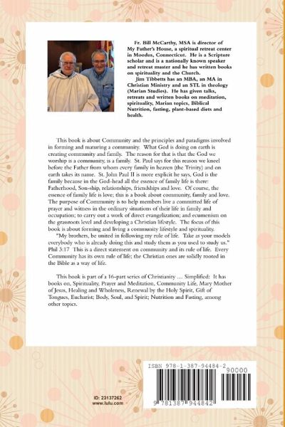 This book is about Community and the principles and paradigms involved in forming and maturing a community. What God is doing on earth is creating community and family. The reason for that is that the God we worship is a community, is a family. St. Paul says for this reason we kneel before the Father from whom every family in heaven (the Trinity) and on earth takes its name. St. John Paul II is more explicit he says, God is the family because in the God-head all the essence of family life is there: Fatherhood, Son-ship, relationships, friendships and love. Of course the essence of family life is love. So this is a book about community, family and love. The purpose of Community is to help members live a committed Catholic life of prayer and witness in the ordinary situations of their life in family and occupation; to carry out a work of direct evangelization; ecumenism on the grassroots level and more. The focus of this book is about forming and living a community lifestyle and spirituality.