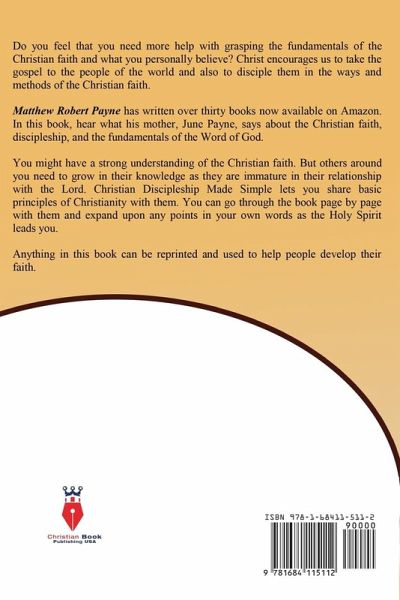 Do you feel that you need more help with grasping the fundamentals of the Christian faith and what you personally believe? Christ encourages us to take the gospel to the people of the world and also to disciple them in the ways and methods of the Christian faith. Matthew Robert Payne has written over thirty books now available on Amazon. In this book, hear what his mother, June Payne, says about the Christian faith, discipleship, and the fundamentals of the Word of God. You might have a strong understanding of the Christian faith. But others around you need to grow in their knowledge as they are immature in their relationship with the Lord. Christian Discipleship Made Simple lets you share basic principles of Christianity with them. You can go through the book page by page with them and expand upon any points in your own words as the Holy Spirit leads you. Anything in this book can be reprinted and used to help people develop their faith.