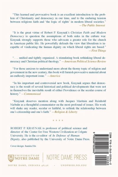Do Christianity and modern liberal democracy share a common moral vision, or are they opposed and even hostile to each other? In Christian Faith and Modern Democracy, Robert Kraynak challenges the commonly accepted view that Christianity is inherently compatible with modern democratic society. Contrary to conventional wisdom, Kraynak argues that there is no necessary connection between Christianity and any form of government and that, in many important respects, Christianity is weakened by its close alliance with contemporary versions of democracy and human rights. Christian Faith and Modern Democracy was written, in part, to convince secular intellectuals that modern democracy needs God. But it was also written in response to the new consensus about politics that has emerged among Christian believers. Almost all churches and theologians now think that the form of government most compatible with Christianity is democracy and that the historic opposition of the Christian tradition to democracy and to various forms of liberalism was a mistake. What caused Christians to change their view of political authority and to embrace liberal democracy? Were they wise to change their view? This provocative book attempts to answer these questions by reexamining the relationship between democracy and Christianity through the lens of St. Augustine's distinction between the city of God and the earthly city, applied to the conditions of the modern age. Kraynak argues that St. Augustine's teaching provides the basis for a Christian theory of constitutional government and permits a variety of legitimate forms of government, including constitutional democracy. Yet, unlike contemporary Christian doctrines, it does so without embracing the subversive premises of liberalism that have threatened to turn the Christian faith into little more than a mirror image of the modern world. Sure to spark controversy among secular intellectuals and Christian believers alike, this insightful volume is an outstanding work of political philosophy with a firm foundation in theology.
