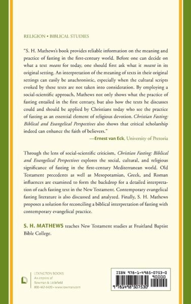 By analyzing Old and New Testament texts on fasting, Christian Fasting: Biblical and EvangelicalPerspectives reveals the social, cultural, and religious significance of this practice in the first-century Mediterranean world. It then compares the biblical representation of fasting with fasting in contemporary Evangelical literature and practice.