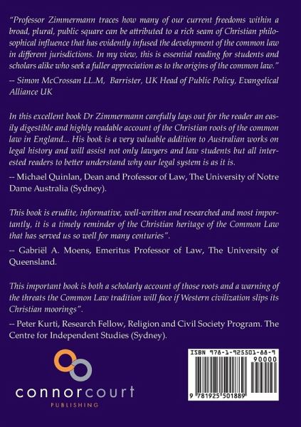"Professor Zimmermann traces how many of our current freedoms within a broad, plural, public square can be attributed to a rich seam of Christian philosophical influence that has evidently infused the development of the common law in different jurisdictions. In my view, this is essential reading for students and scholars alike who seek a fuller appreciation as to the origins of the common law." -- Simon McCrossan LL.M, Barrister, UK Head of Public Policy, Evangelical Alliance UK In this excellent book, Dr Zimmermann carefully lays out for the reader an easily digestible and highly readable account of the Christian roots of the common law in England... His book is a very valuable addition to Australian works on legal history and will assist not only lawyers and law students but all interested readers to better understand why our legal system is as it is. -- Michael Quinlan, Dean and Professor of Law, The University of Notre Dame Australia (Sydney). This book is erudite, informative, well-written and researched and most importantly, it is a timely reminder of the Christian heritage of the Common Law that has served us so well for many centuries". -- Gabriël A. Moens, Emeritus Professor of Law, The University of Queensland. This important book is both a scholarly account of those roots and a warning of the threats the Common Law tradition will face if Western civilization slips its Christian moorings". -- Peter Kurti, Research Fellow, Religion and Civil Society Program. The Centre for Independent Studies (Sydney).