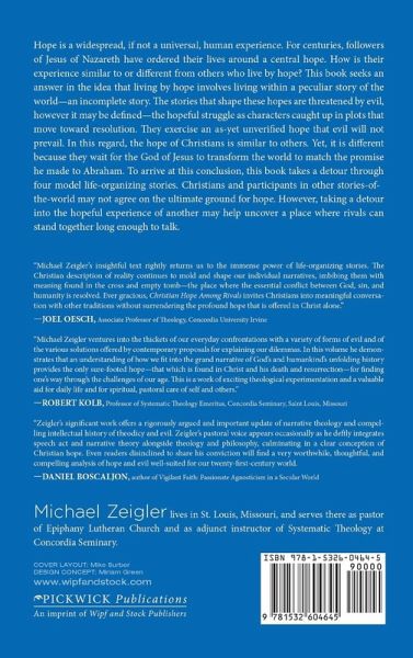 Hope is a widespread, if not a universal, human experience. For centuries, followers of Jesus of Nazareth have ordered their lives around a central hope. How is their experience similar to or different from others who live by hope? This book seeks an answer in the idea that living by hope involves living within a peculiar story of the world--an incomplete story. The stories that shape these hopes are threatened by evil, however it may be defined--he hopeful struggle as characters caught up in plots that move toward resolution. They exercise an as-yet unverified hope that evil will not prevail. In this regard, the hope of Christians is similar to others. Yet, it is different because they wait for the God of Jesus to transform the world to match the promise he made to Abraham. To arrive at this conclusion, this book takes a detour through four model life-organizing stories. Christians and participants in other stories-of-the-world may not agree on the ultimate ground for hope. However, taking a detour into the hopeful experience of another may help uncover a place where rivals can stand together long enough to talk. ""Michael Zeigler's insightful text rightly returns us to the immense power of life-organizing stories. The Christian description of reality continues to mold and shape our individual narratives, imbibing them with meaning found in the cross and empty tomb--the place where the essential conflict between God, sin, and humanity is resolved. Ever gracious, Christian Hope Among Rivals invites Christians into meaningful conversation with other traditions without surrendering the profound hope that is offered in Christ alone."" --Joel Oesch, Associate Professor of Theology, Concordia University Irvine ""Michael Zeigler ventures into the thickets of our everyday confrontations with a variety of forms of evil and of the various solutions offered by contemporary proposals for explaining our dilemmas. In this volume he demonstrates that an understanding of how we fit into the grand narrative of God's and humankind's unfolding history provides the only sure-footed hope--that which is found in Christ and his death and resurrection--for finding one's way through the challenges of our age. This is a work of exciting theological experimentation and a valuable aid for daily life and for spiritual, pastoral care of self and others."" --Robert Kolb, Professor of Systematic Theology Emeritus, Concordia Seminary, Saint Louis, Missouri ""Zeigler's significant work offers a rigorously argued and important update of narrative theology and compelling intellectual history of theodicy and evil. Zeigler's pastoral voice appears occasionally as he deftly integrates speech act and narrative theory alongside theology and philosophy, culminating in a clear conception of Christian hope. Even readers disinclined to share his conviction will find a very worthwhile, thoughtful, and compelling analysis of hope and evil well-suited for our twenty-first-century world. --Daniel Boscaljon, author of Vigilant Faith: Passionate Agnosticism in a Secular World ""Zeigler models honest engagement in an environment where Christian thought is no longer the starting point for dialogue. By opening us up to rival 'life-organizing stories,' he demonstrates clearly what makes Christian hope truly unique: Jesus. With an academic mind and a pastoral heart, Zeigler offers not only a new way of thinking about Christian hope, but a new way of thinking about theology. Read this book."" --Justin Rossow, Senior Pastor, St. Luke Lutheran Church, Ann Arbor, Michigan ""Christian Hope Among Rivals invites its reader--Christian or otherwise--to self-understanding and respectful dialogue. Zeigler shows that every attempt to 'make sense' of the world that we all know results in a life-organizing story that offers hope. Zeigler helps Christians readers find emphatic contact with others who do not trust in the Triune God. He encourages Christians to live in the hop