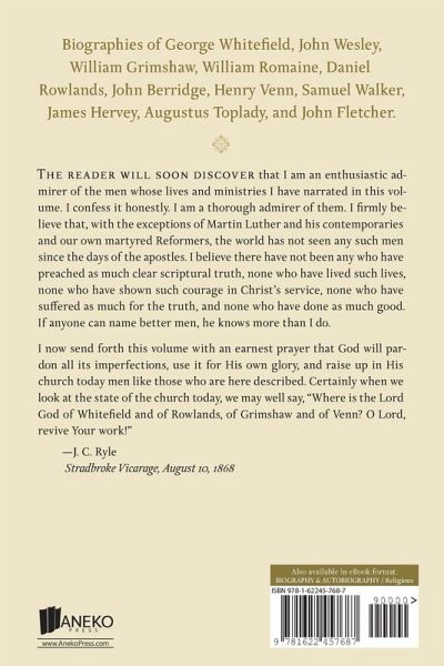 Biographies of George Whitefield, John Wesley, William Grimshaw, William Romaine, Daniel Rowlands, John Berridge, Henry Venn, Samuel Walker, James Hervey, Augustus Toplady, and John Fletcher. The reader will soon discover that I am an enthusiastic admirer of the men whose lives and ministries I have narrated in this volume. I confess it honestly. I am a thorough admirer of them. I firmly believe that, with the exceptions of Martin Luther and his contemporaries and our own martyred Reformers, the world has not seen any such men since the days of the apostles. I believe there have not been any who have preached as much clear scriptural truth, none who have lived such lives, none who have shown such courage in Christ's service, none who have suffered as much for the truth, and none who have done as much good. If anyone can name better men, he knows more than I do. My purpose in compiling these biographies was to present to the public the lives, characters, and work of the leading ministers whom God used to revive Christianity in England in the eighteenth century. I had long believed that these great men were not sufficiently known, and as a consequence, their value and merit had not been sufficiently recognized. I thought that the church and the world should know something more than they seem to know about such men as Whitefield, Wesley, Romaine, Rowlands, Grimshaw, Berridge, Venn, Toplady, Hervey, Walker, and Fletcher. For twenty years, I waited anxiously for some worthy account of these mighty spiritual heroes. At last I became weary of waiting, and I resolved to take the pen in my own hand and do what I could in the pages of this book. I now send forth this volume with an earnest prayer that God will pardon all its imperfections, use it for His own glory, and raise up in His church today men like those who are here described. Certainly when we look at the state of the church today, we may well say, "Where is the Lord God of Whitefield and of Rowlands, of Grimshaw and of Venn? O Lord, revive Your work!" -J. C. Ryle Stradbroke Vicarage, August 10, 1868