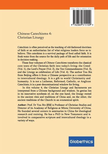 Catechism is often perceived as the teaching of old-fashioned doctrines of faith or an authoritarian list of what religious leaders force us to believe. This catechism is a survival package of food called faith. It is fresh water from the source for the daily path of life and for orientation in decision-making. These four volumes of Chinese Catechisms transform the classical core texts of the Christian faith into today's living: the Creed (Vol. 1), the Lord's Prayer (Vol. 2), the Ten Commandments (Vol. 3), and the Liturgy as celebration of Life (Vol. 4). The author You Bin from Beijing offers it from a Chinese perspective as a contribution to intercultural theology. It is a gift to world Christianity and humanity. It is not a Lutheran, Reformed, Catholic, or Anglican Catechism; it is a post-denominational window for living. In this volume 4, the Lord's Prayer is interpreted from a Chinese background and wisdom. Its genius lies in its innovative synthesis of, on the one hand, the liturgy rooted in the ancient rites and traditions of China and, on the other, the ancient traditions of the Church in an ecumenical spirit.