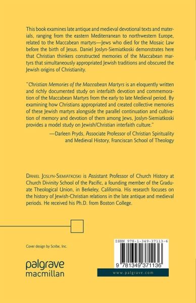 " Christian Memories of the Maccabean Martyrs is an eloquently written and richly documented study on interfaith devotion and commemoration of the Maccabean Martyrs from the early to late Medieval period. By examininghow Christians appropriated and created collective memories of these Jewish martyrs alongside the parallel continuation and cultivation of memory and devotion of them among Jews,Joslyn-Siemiatkoski provides a model study on Jewish/Christian interfaith culture." - Darleen Pryds, Associate Professor of Christian Spirituality and Medieval History, Franciscan School of Theology