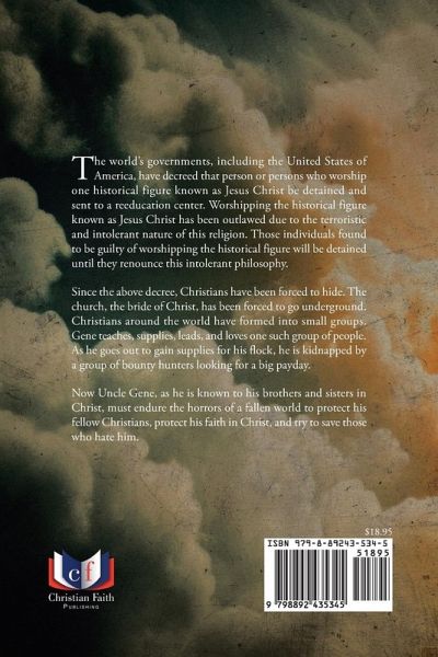 The world's governments, including the United States of America, have decreed that person or persons who worship one historical figure known as Jesus Christ be detained and sent to a reeducation center. Worshipping the historical figure known as Jesus Christ has been outlawed due to the terroristic and intolerant nature of this religion. Those individuals found to be guilty of worshipping the historical figure will be detained until they renounce this intolerant philosophy. Since the above decree, Christians have been forced to hide. The church, the bride of Christ, has been forced to go underground. Christians around the world have formed into small groups. Gene teaches, supplies, leads, and loves one such group of people. As he goes out to gain supplies for his flock, he is kidnapped by a group of bounty hunters looking for a big payday. Now Uncle Gene, as he is known to his brothers and sisters in Christ, must endure the horrors of a fallen world to protect his fellow Christians, protect his faith in Christ, and try to save those who hate him. 2