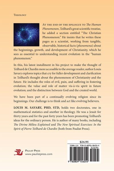 At the end of the epilogue to The Human Phenomenon, Teilhard's great scientific treatise, he added a section entitled "The Christian Phenomenon." He insists that he writes these pages as a scientist, working from tangible, observable, historical facts (phenomena) about the beginnings, growth, and development of Christianity, which he sees as essential to understanding recent evolution in the "human phenomenon." In this, his latest installment in his project to make the thought of Teilhard de Chardin more accessible to the average reader, author Louis Savary explores topics that cry for fuller development and clarification in Teilhard's thought about the phenomenon of Christianity and the future. He includes the role of evil, pain and suffering in fostering evolution, the value and role of matter vis-à-vis spirit in future evolution, and the distinction between God and the created world. We have been part of a continually evolving religion since its beginnings. Our challenge is to think and act like evolving believers. Louis M. Savary, PhD, STD, holds two doctorates, one in mathematical statistics and another in theology. He was a Jesuit for thirty years and for the past forty years has been promoting Teilhard's ideas for the ordinary person. He is author of many books, including "The Divine Milieu" Explained and The New Spiritual Exercises in the Spirit of Teilhard de Chardin (both from Paulist Press). +