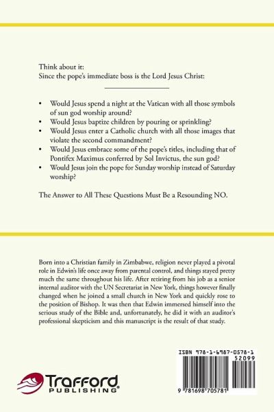 Think about it: Since the pope's immediate boss is the Lord Jesus Christ: _________________ Would Jesus spend a night at the Vatican with all those symbols of sun god worship around? Would Jesus baptize children by pouring or sprinkling? Would Jesus enter a Catholic church with all those images that violate the second commandment? Would Jesus embrace some of the pope's titles, including that of Pontifex Maximus conferred by Sol Invictus, the sun god? Would Jesus join the pope for Sunday worship instead of Saturday worship? The Answer to All These Questions Must Be a Resounding NO.