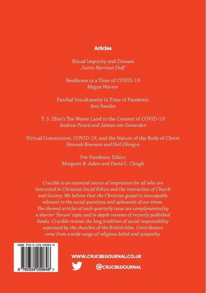 Articles Ritual Impurity and Disease: 07 Reflections on Biblical 'Analogies' in the COVID Era - Justin Harrison Duff Resilience in a Time of COVID-19 - Three Biblical Models: 16 Plague, Uncleanness and Indigestion - Megan Warner Paschal Simultaneity in Time of Pandemic: 24 A Liturgical Theological Response to COVID-19. - Ann Swailes A Theological Engagement with T. S. Eliot's The Waste Land 32 in the Context of COVID-19 - Andrew Picard and Jaimee van Gemerden Virtual Communion, COVID-19, and the Nature of 40 the Body of Christ - Hannah Bowman and Neil Dhingra Pre-Pandemic Ethics: 49 Triage and Discrimination - Margaret B. Adam and David L. Clough Book Reviews: 57 Beth Dodd, Martin Kettle, Jonathan Dean, Cathy Ross, Christopher Swift