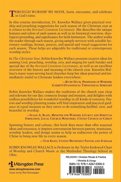 In this concise guide, Dr. Knowles Wallace gives practical worship and preaching suggestions for each season of the Christian year as it relates to the Revised Common Lectionary. She describes the unique features and colors of each season as well as its historical overview, theological grounding, and significance for faith formation.The Christian Yeargives ways to draw upon the gifts of existing congregations while seeking to expand their witness and faith formation. The authorwalks the reader through each season, beginning with Advent, followed by Christmas, Epiphany, Ordinary Time in Light of Epiphany, Lent, Palm Sunday to Holy Saturday, Easter through Pentecost, and Ordinary Time as People of the Resurrection, giving sample services with suitable lectionary readings, hymns, prayers, and spatial and visual suggestions for each season in either traditional or contemporary worship styles."