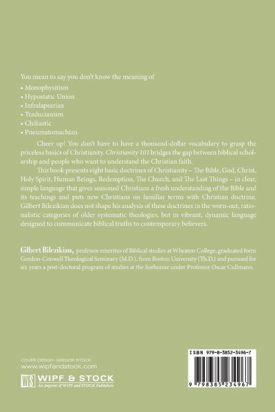 You mean to say you don't know the meaning of - Monophysitism - Hypostatic Union - Infralapsarian - Traducianism - Chiliastic - Pneumatomachian Cheer up! You don't have to have a thousand-dollar vocabulary to grasp the priceless basics of Christianity. Christianity 101 bridges the gap between biblical scholarship and people who want to understand the Christian faith. This book presents eight basic doctrines of Christianity - The Bible, God, Christ, Holy Spirit, Human Beings, Redemption, The Church, and The Last Things - in clear, simple language that gives seasoned Christians a fresh understanding of the Bible and its teachings and puts new Christians on familiar terms with Christian doctrine. Gilbert Bilezikian does not shape his analysis of these doctrines in the worn-out, rationalistic categories of older systematic theologies, but in vibrant, dynamic language designed to communicate biblical truths to contemporary believers.