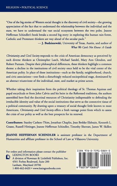 Christianity and Civil Society responds to the crisis of American democracy as perceived by such diverse thinkers as Christopher Lasch, Michael Sandel, Mary Ann Glendon, and Robert Putnam. Despite their philosophical differences, these thinkers highlight a common theme: a decline in the institutions of civil society once held to be the vital center of the American polity. In place of these institutions-such as the family, neighborhood, church, and civic associations-one finds a disturbingly reduced socio-political stage, dominated by an abstract triumvirate of the individual, state, and market as prime actors. Whether taking their inspiration from the political theology of St. Thomas Aquinas and papal encyclicals or from John Calvin and his heirs in the Reformed traditions, the authors assembled here find the doctrinal resources of Christianity indispensable to defending the irreducible identity and value of the social institutions that serve as the connective tissue of a political community. By drawing upon a treasury of social thought little known to most Americans, Christianity and Civil Society offers a fresh vantage point from which to assess the crisis of our polity as well as the best prospects for its renewal.