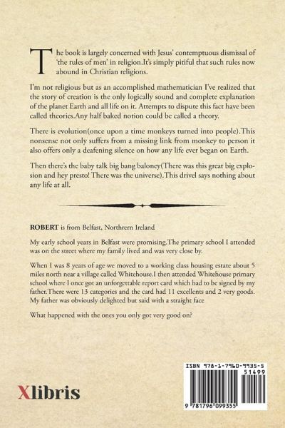 The book is largely concerned with Jesus' contemptuous dismissal of 'the rules of men' in religion.It's simply pitiful that such rules now abound in Christian religions. I'm not religious but as an accomplished mathematician I've realized that the story of creation is the only logically sound and complete explanation of the planet Earth and all life on it. Attempts to dispute this fact have been called theories.Any half baked notion could be called a theory. There is evolution(once upon a time monkeys turned into people).This nonsense not only suffers from a missing link from monkey to person it also offers only a deafening silence on how any life ever began on Earth. Then there's the baby talk big bang baloney(There was this great big explosion and hey presto! There was the universe).This drivel says nothing about any life at all.