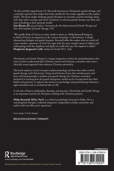 "In this carefully argued book, Dr. Brownell interweaves Christianity, gestalt therapy, and a scholarly expertise that makes this book valuable for the reader regardless of the reader's beliefs. This book might challenge gestalt therapists to seriously consider theology along with their other concepts and invite Christians to welcome gestalt therapy into their own ways of looking at their spiritual worlds." Dan Bloom, JD, past president, Association for the Advancement of Gestalt Therapy and New York Institute of Gestalt Therapy, USA