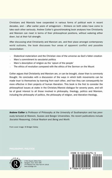 Christians and Marxists have co-operated in various forms of political work in recent decades, and, after earlier years of antagonism, thinkers on both sides have come to take the other seriously. The aim of this book is to get Christianity and Marxism to meet on terrain on which they might seem most opposed: their philosophical positions; and to do so without watering either down, but taking then full strength.