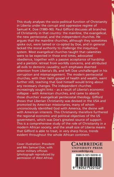 This study examines the role of Christianity in Liberia under the corrupt rule of Samuel K. Doe (1980 90).