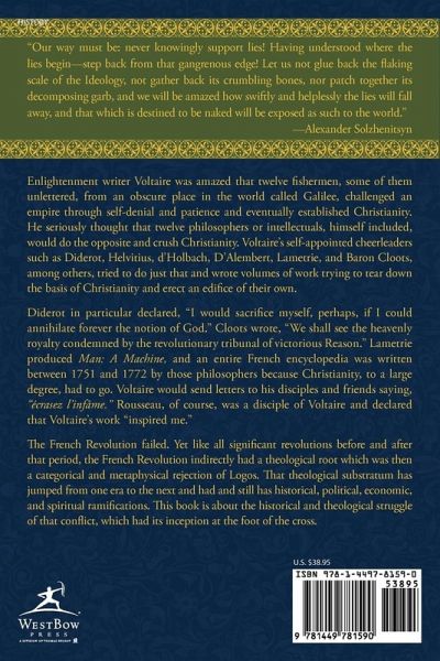 "Our way must be: never knowingly support lies! Having understood where the lies begin-step back from that gangrenous edge! Let us not glue back the flaking scale of the Ideology, not gather back its crumbling bones, nor patch together its decomposing garb, and we will be amazed how swiftly and helplessly the lies will fall away, and that which is destined to be naked will be exposed as such to the world." -Alexander Solzhenitsyn Enlightenment writer Voltaire was amazed that twelve fishermen, some of them unlettered, from an obscure place in the world called Galilee, challenged an empire through self-denial and patience and eventually established Christianity. He seriously thought that twelve philosophers or intellectuals, himself included, would do the opposite and crush Christianity. Voltaire's self-appointed cheerleaders such as Diderot, Helvitius, d'Holbach, D'Alembert, Lametrie, and Baron Cloots, among others, tried to do just that and wrote volumes of work trying to tear down the basis of Christianity and erect an edifice of their own. Diderot in particular declared, "I would sacrifice myself, perhaps, if I could annihilate forever the notion of God." Cloots wrote, "We shall see the heavenly royalty condemned by the revolutionary tribunal of victorious Reason." Lametrie produced Man: A Machine, and an entire French encyclopedia was written between 1751 and 1772 by those philosophers because Christianity, to a large degree, had to go. Voltaire would send letters to his disciples and friends saying, "écrasez l'infâme." Rousseau, of course, was a disciple of Voltaire and declared that Voltaire's work "inspired me." The French Revolution failed. Yet like all significant revolutions before and after that period, the French Revolution indirectly had a theological root which was then a categorical and metaphysical rejection of Logos. That theological substratum has jumped from one era to the next and had and still has historical, political, economic, and spiritual ramifications. This book is about the historical and theological struggle of that conflict, which had its inception at the foot of the cross.