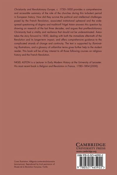 Christianity and Revolutionary Europe, 1750-1830, first published in 2003, provides a comprehensive and accessible summary of the role of the churches during this turbulent period in European history. How did the churches survive the political and intellectual challenges posed by the French Revolution, despite institutional upheaval and the widespread questioning of dogma and tradition? Nigel Aston answers this question by drawing on three decades of research, and argues that pre-Revolutionary Christianity had a vitality and resilience that should not be underestimated. Aston takes the story forward to 1830, dealing with both the immediate aftermath of the Revolution and its longer-term impact and offering comprehensive guidance to the complicated strands of change and continuity. The text is supported by illuminating illustrations, and a glossary of unfamiliar terms gives further help to the student reader. It will be of key interest to all those following courses on religious history and the French Revolution.