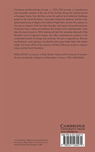 Christianity and Revolutionary Europe, 1750-1830, first published in 2003, provides a comprehensive and accessible summary of the role of the churches during this turbulent period in European history. How did the churches survive the political and intellectual challenges posed by the French Revolution, despite institutional upheaval and the widespread questioning of dogma and tradition? Nigel Aston answers this question by drawing on three decades of research, and argues that pre-Revolutionary Christianity had a vitality and resilience that should not be underestimated. Aston takes the story forward to 1830, dealing with both the immediate aftermath of the Revolution and its longer-term impact and offering comprehensive guidance to the complicated strands of change and continuity. The text is supported by illuminating illustrations, and a glossary of unfamiliar terms gives further help to the student reader. It will be of key interest to all those following courses on religious history and the French Revolution.