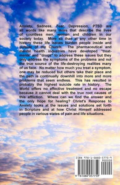 Anxiety, sadness, fear, depression, and PTSD are words like many more that describe the lives of countless men, women, and children in our society today. More so than at any other time in history these life issues burden people inside and outside of the Church. The pharmaceutical and mental health industries have developed "treatments" and "drugs" to address these issues but they only address the symptoms of the problems and not the true source of the life-destroying realities many of us face. No matter how much you treat a symptom, one may be reduced but others take their place and the path is continually downhill into more and more problems that seem endless. This has resulted in probably the highest suicide rate in history. The World offers no effective treatment and no escape because it cannot deal with the true root causes of this affliction. Where can we find the answer and the only hope for healing? How Christ Addressed Anxiety looks at the issues and solutions set forth in Scripture and at how Christ Himself addressed people in various sates of pain and life situations.