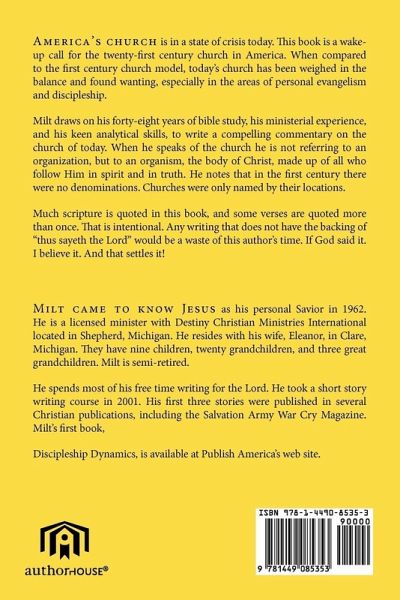 This book is a wake-up call for the twenty-first century church. Milt compares today's church with the first century church model. He believes the church has been weighed in the balance and found wanting, especillay in the areas of personal evangelism and discipleship. He draws on his forty-eight years of bible study, his ministerial experience, and his keen analytical skills to assess what's wrong with the church and gives suggestions on what can be done to fix it. When Milt speaks of the church he is referring, not to an organization, but to an organism, the body of Christ, made up of all true followers of Christ, irregardless of their denominational affiliation. Bible texts are from either the KJV or the NKJV bibles. Much scripture is quoted in this book. This is iinten- tional."Thus sayeth the Lord " is what gives any Christian work its sanction and authority. If God said it. I believe it. And that settles it.