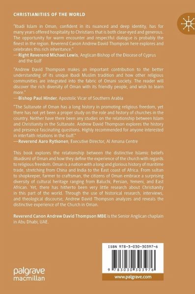 This book explores the relationship between the distinctive Islamic beliefs (Ibadism) of Oman and how they define the experience of the church with regards to religious freedom. Oman is a nation with a long and glorious history of maritime trade, stretching from China and India to the East coast of Africa. From sultan to shopkeeper, farmer to craftsman, the citizens of Oman embrace a surprising diversity of cultural heritage ranging from Baluchi, Persian, Yemeni, and East African. Yet, there has hitherto been very little research about Christianity in this part of the world. Through the use of historical research, interviews and theological discourse, Andrew David Thompson analyzes and reveals the distinctive experience of the Church in Oman.