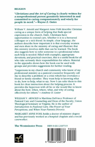 William V. Arnold and Margaret Anne Fohl describe Christian caring as a unique form of helping that finds special expression in the church. Daily, Christians have opportunities to extend care, whether it is to a bereaved colleague or a sick friend. In simple, clear language, the authors describe how important it is that everyday women and men share in the ministry of caring and illustrate that this ministry involves skills that can be learned. The book also suggests how to refer someone to a professional when such help is needed. Filled with examples, appropriate devotions, and practical exercises, this is a useful book for all who take seriously their responsibilities for others. Material in the appendix shows how the book can be used with groups and provides suggestions for further reading.