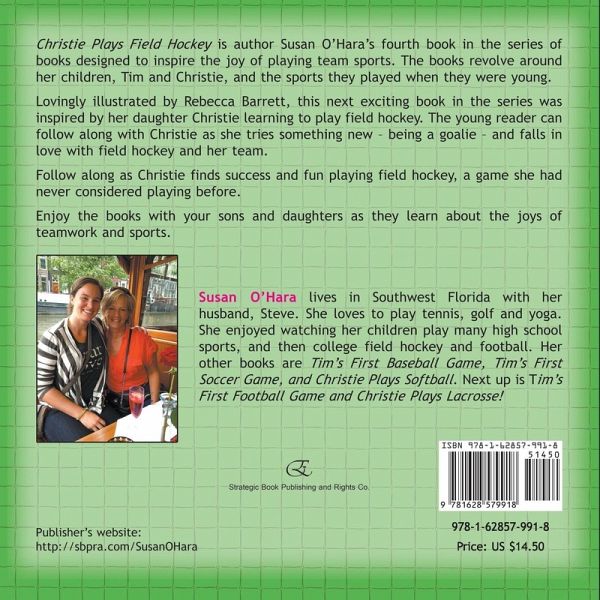 Christie Plays Field Hockey is author Susan O'Hara's fourth book in the series of books designed to inspire the joy of playing team sports. The books revolve around her children, Tim and Christie, and the sports they played when they were young. Lovingly illustrated by Rebecca Barrett, this next exciting book in the series was inspired by her daughter Christie learning to play field hockey. The young reader can follow along with Christie as she tries something new - being a goalie - and falls in love with field hockey and her team. Follow along as Christie finds success and fun playing field hockey, a game she had never considered playing before. Enjoy the books with your sons and daughters as they learn about the joys of teamwork and sports. Susan O'Hara lives in Southwest Florida with her husband, Steve. She loves to play tennis, golf and yoga. She enjoyed watching her children play many high school sports, and then college field hockey and football. Her other books are Tim's First Baseball Game, Tim's First Soccer Game, and Christie Plays Softball. Next up areTim's First Football Game and Christie Plays Lacrosse!