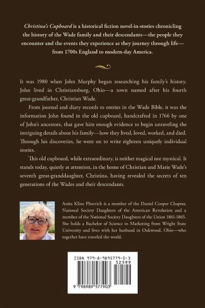 Christina's Cupboard is a historical fiction novel-in-stories chronicling the history of the Wade family and their descendants-the people they encounter and the events they experience as they journey through life-from 1700s England to modern-day America. It was 1980 when John Murphy began researching his family's history. John lived in Christiansburg, Ohio-a town named after his fourth great-grandfather, Christian Wade. From journal and diary records to entries in the Wade Bible, it was the information John found in the old cupboard, handcrafted in 1766 by one of John's ancestors, that gave him enough evidence to begin unraveling the intriguing details about his family-how they lived, loved, worked, and died. Through his discoveries, he went on to write eighteen uniquely individual stories. This old cupboard, while extraordinary, is neither magical nor mystical. It stands today, quietly at attention, in the home of Christian and Marie Wade's seventh great-granddaughter, Christina, having revealed the secrets of ten generations of the Wades and their descendants