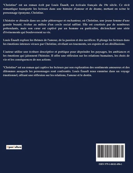 Dans "Christine" de Louis Énault, l'intrigue se déroule principalement à Stockholm, où le lac Mélar devient le théâtre de rencontres et de révélations. Le protagoniste, Georges de Simiane, un jeune diplomate français, est nouvellement arrivé en Suède. Il est rapidement fasciné par la comtesse Christine de Rudden, une femme d'une beauté et d'une grâce changeantes, mais aussi d'une simplicité désarmante. Christine, veuve d'un mariage malheureux, est entourée d'admirateurs, dont le major baron de Vendel, qui nourrit pour elle une affection sincère et chevaleresque. Georges, bien qu'habitué aux intrigues amoureuses, se trouve déconcerté par l'absence de Christine, qui doit se rendre à Upsala pour des raisons familiales. Cette distance involontaire intensifie son intérêt pour elle, transformant une simple curiosité en une affection plus marquée. Le récit explore les thèmes de l'amour, de l'absence et de la quête de la beauté intérieure, tout en peignant un tableau vivant de la société suédoise du XIXe siècle. Les descriptions détaillées des paysages hivernaux et des coutumes locales enrichissent l'histoire, offrant un contraste saisissant entre la froideur du climat et la chaleur des émotions humaines.