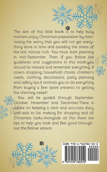 The aim of this little book is to help busy mothers enjoy Christmas preparation by minimising the worry that you will not get everything done in time and avoiding the stress of the last minute rush. You must start planning in mid-September. Then, if you follow the guidelines and suggestions in this book,you should be relaxed and remember everything. It covers shopping, household chores, children's needs, clothing, decorations, party planning and safety tips.It reminds you to do everything from buying a few spare presents to getting the chimney swept! You will be guided through September, October, November and December.There is advice on keeping a clear and accurate diary and aids to list making for shopping and all Christmas tasks.Alongside all this there are tips to help you look and feel good throughout the festive season.