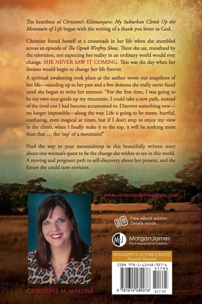 Christine's Kilimanjaro is a memoir about one woman's suburban climb up the mountain of life, with a clear message in understanding the power of your vision and the ability to change your destiny.