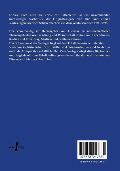 Dieses Buch über die christliche Sittenlehre ist ein unveränderter, hochwertiger Nachdruck der Originalausgabe von 1891 und enthält Vorlesungen Friedrich Schleiermachers aus dem Wintersemester 1822 - 1823.