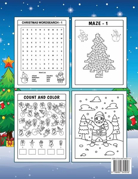 CHRISTMAS STOCKING - ACTIVITY BOOK - PERFECT GIFT The ultimate Christmas Activity book and a must-have for any 4- to 8-year-old child practicing their fine motor skills, hand-eye coordination, and concentration! We have included a tremendous variety of puzzles with a range of difficulty levels so everyone from beginner to experienced puzzlers will have plenty to enjoy. This unbelievable collection includes something for everyone to love. You get to complete many different pages, including word searches, color by number, count and color, coloring pages, mazes, spot the difference, jokes and more!Why You Will Love this BookBoost your child's academic confidence! Every page is designed with your 4- to 8-year-old in mind. Growing their concentration and abilities as they progress through the book. Packed with unique Fresh Puzzles. That is guaranteed to keep your little one away from screen time for many hours. Great for All Skill Levels. The activities are arranged in order to keep your little one engaged.