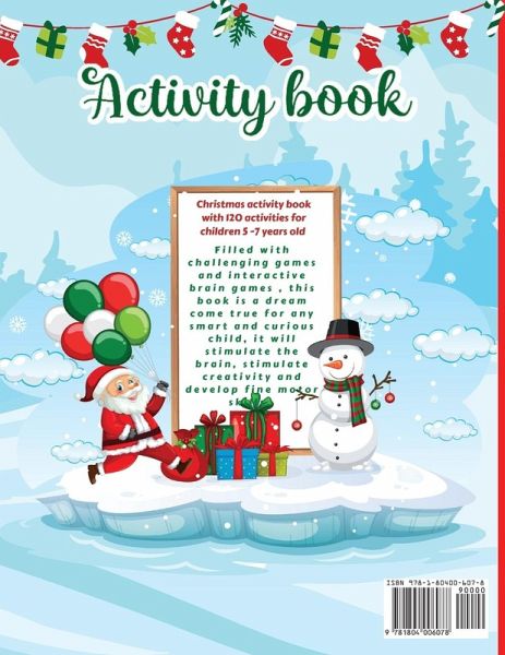 This awesome coloring and activity book is jam-packed with cute and simple Christmas-themed artwork with Snowmen, Reindeer, Santa Claus, and more! The book is filled with many different activities. Kids can build the ability to concentrate, solve brain games, and color. What's inside? 120 activities such as: Coloring: coloring pages, color by number, color by code Dot to Dot Find the differences Tracing Matching games Counting Mazes games Drawing games: copy the picture, draw the other half Easy Crossword, Word Scramble, Word search Celebrate Christmas with this adorable Activity Book for Kids Ages 5-7! Kids will definitely love it. This book can be a great Christmas gift to unlock a world of activity fun and learning.