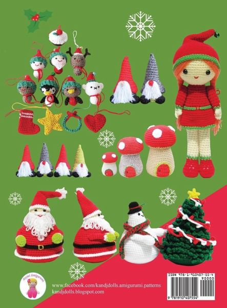 Christmas Amigurumi is a collection of great crochet patterns for Christmas. Included are a snowman, santa claus, christmas tree, a christmas doll, trolls and small decorative Christmas figurines for the Christmas tree. You need a basic knowledge of crochet to read the patterns. Sizes: You can make the doll smaller or bigger by using different yarn and hook, without changing the patterns. The small dolls are 1.8 to 2.6 inches (4.5 to 6.5 cm) high. The big dolls are 5 to 8.5 inches (12.5 cm to 21.5 cm) high. The size of the doll depends on the size of the crochet hook, the thickness of yarn and how you stuff it; a bigger hook and thicker yarn make a bigger doll. A doll stuffed tightly is bigger than a loose stuffed doll.