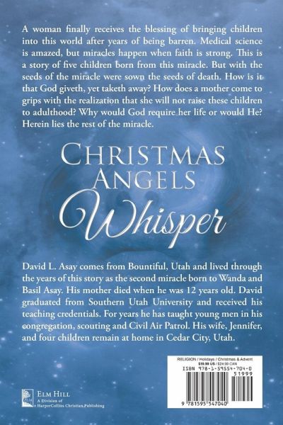 Miracles come after the trial of faith, yet there may still be trials after the miracle. Christmas would teach this mother that though she participated in the miracle of having children; perhaps the price of the miracle would mean that she wouldn't be there to raise them to adulthood. Christmas Angels Whisper is that story.