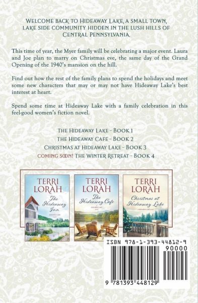 Welcome to Christmas at Hideaway Lake. Join the Myer family again in the 3rd feel-good women's fiction novel about the love, friendship, and family ties set in the lush hills of this small Pennsylvania lake side town. You are cordially invited to the wedding of Laura & Joe, along with the grand opening of the 1940s renovated mansion on the hill.