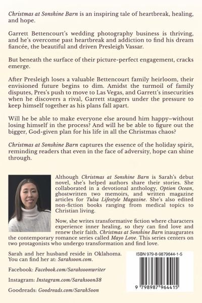 What if on the night you're engaged, you have a vision of a woman in a red gown who isn't your fiancée? ¿ Garrett Bettencourt's wedding photography business is thriving, and he's overcome past heartbreak and addiction to find his dream fiancée, the beautiful and driven Presleigh Vassar. But beneath the surface of their picture-perfect engagement, cracks emerge. After Presleigh loses a valuable Bettencourt heirloom, their envisioned future begins to dim. Amidst the turmoil of family disputes, Pres's push to move to Las Vegas, and Garrett's insecurities when he discovers a rival, he staggers under the pressure to keep himself together as his plans fall apart. Taking refuge in the great outdoors of Northern Michigan, he seeks to find answers during his Christmas vacation with family. With all the Christmas chaos and seeing the mysterious woman in a vision again, can Garrett determine whether God wants him and Pres to move forward? If so, how? And will he discover who this woman in red is? Christmas at Sonshine Barn captures the essence of the holiday spirit, reminding readers that even in the face of adversity, hope can shine through.